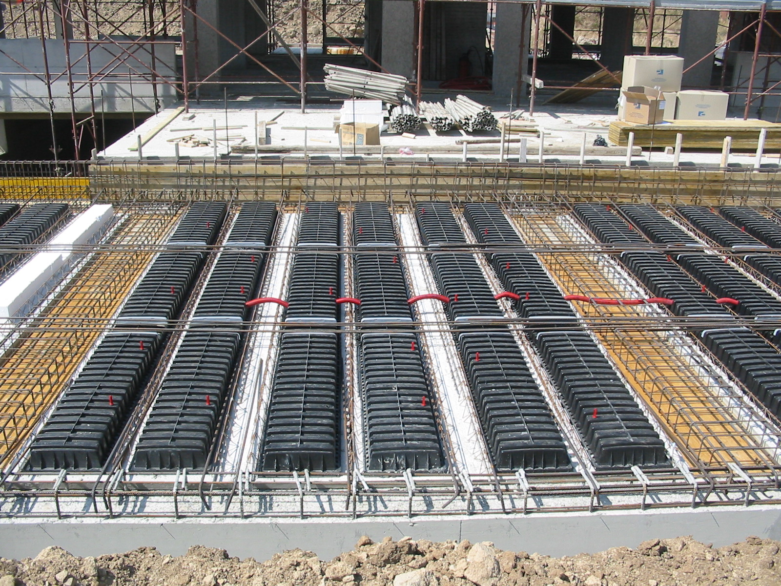 Prima della fase di getto si può predisporre una canalizzazione collegata sia longitudinalmente che trasversalmente tra le file di TEGOPLAST sfruttando i prefori posizionati sui fianchi e il vuoto per consentire l’eventuale passaggio di impianti elettrici, di riscaldamento, idrici e di scarico con tubi di idoneo diametro.